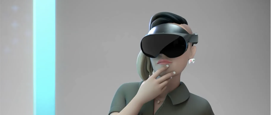 这些视频展示了CG角色(如GIF所示)佩戴一个全新的、深色的VR头显,并进行了参与会议、角色定制和Beat Saber(节奏空间)游戏等活动。外媒The Verge称其为传闻中的Oculus Quest Pro VR头显。