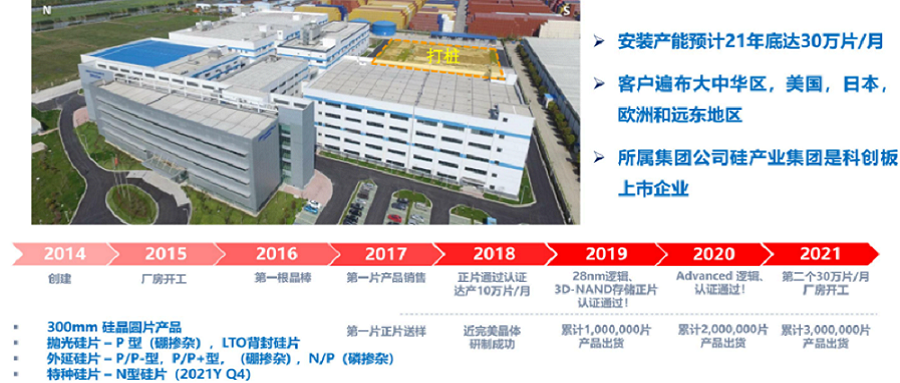 他提到沪硅集团下属有三个子公司,也是法国硅片厂商Soitec的并列大股东之一。其中,上海新昇是国内唯一大量供货正片的300mm大硅片企业,其自2017年第一次正片送样以来,每年都有新的动作。预计在今年年底,其安装产能可达30万片每月。