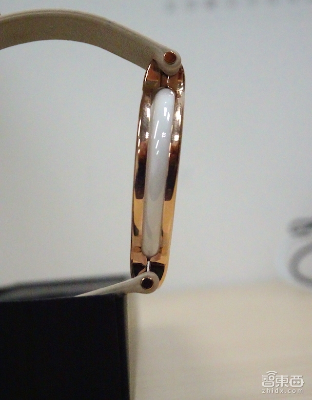 在材质和设计方面,主体采用白陶瓷中空的玉佩式设计,观感和手感都十分温润,其防水级别达到IP68,皮质腕带衔接18K玫瑰金的不锈钢边框,侧面视角中贴合轻薄的镶嵌设计一览无余,玉边与圆角金框设计十分融洽,整体活泼而优雅。