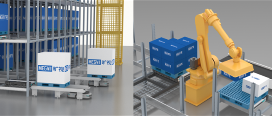 2、旷视四向车+拆码垛机器人:四向车托盘存储+机械臂拆码垛,实现全无人化整箱拣选;使用同一个机械臂进行拆垛和混合码垛,直接完成出库托盘聚合;夜间可用机械臂进行同SKU的托盘合并,提高空间利用率。
