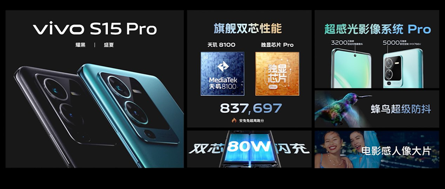 智东西5月19日消息,刚刚vivo发布了vivo S系列新品,其中,vivo S15 Pro采用独家定制索尼IMX766V传感器,搭载联发科天玑8100和独显芯片Pro,支持80W闪充。值得一提的是,距离vivo X80系列发布,仅仅过去了24天。
