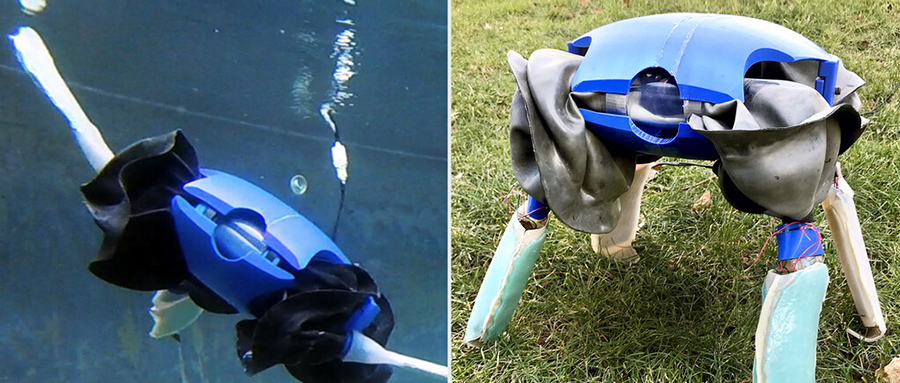 机器龟结合了海龟和陆龟的特点,具有了可变形的四肢,能够根据周围环境调整四肢形状、刚度和动作。当将机器龟从一种环境过渡到另一种环境时,其四肢使用可变刚度材料和人造肌肉来改变其形状。机器龟具有灵活的四肢:
