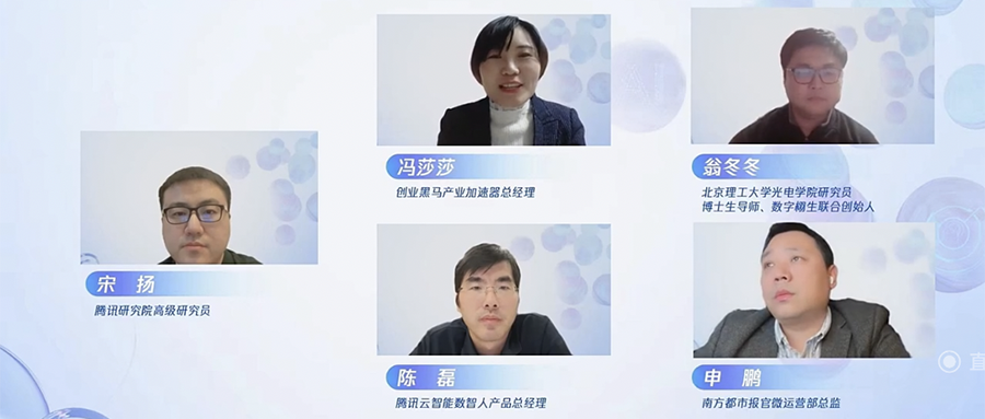智东西12月25日报道,12月20日,由腾讯云智能、腾讯研究院、创业黑马联合主办的“数字人产业发展趋势解读”在线上举行。会上,腾讯云智能数智人产品总经理陈磊、创业黑马产业加速器总经理冯莎莎,北京理工大学光电学院研究员、博士生导师、数字栩生创始人兼CTO翁冬冬,南方都市报官微运营部总监申鹏,共同探讨了数字人产业发展趋势。