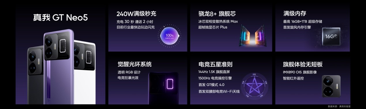 智东西2月9日报道,刚刚真我realme召开了2023年首场新品发布会,发布了新一代电竞旗舰智能手机真我GT Neo5系列。其全球首发量产了240W快充,可以实现“充电30秒,通话2小时”的体验。
