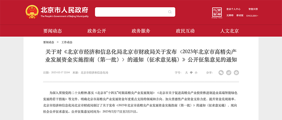 芯东西2月23日报道,北京市经济和信息化局北京市财政局关于发布《2023年北京市高精尖产业发展资金实施指南(第一批)》征求意见稿的公开征集意见阶段于本周二截止。