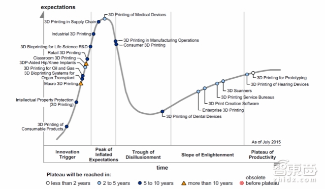 根据Gartner公布的“2015年3D打印技术成熟度曲线”,医疗器械中的3D打印技术已达到期望膨胀期的顶峰,而某些专业应用程序也正逐步纳入医疗保规范。