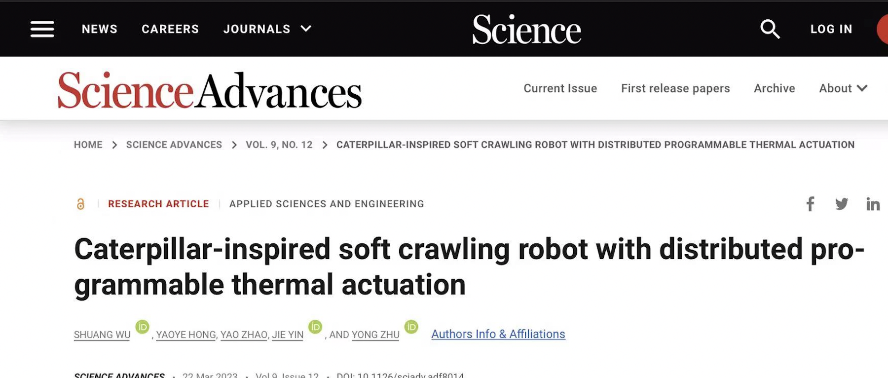 软体爬行机器人在生物医学工程、手术辅助、感知技术等领域受到广泛关注。一直以来,人们从动物世界中获得了很多灵感,也曾有将软材料和软体机器人设计相结合的尝试,例如,章鱼、蛇、毛毛虫等。这些动物具有一些独特的功能,包括多模态运动(multimodal locomotion)、通过狭窄的间隙、在复杂和非结构化的环境中运动。