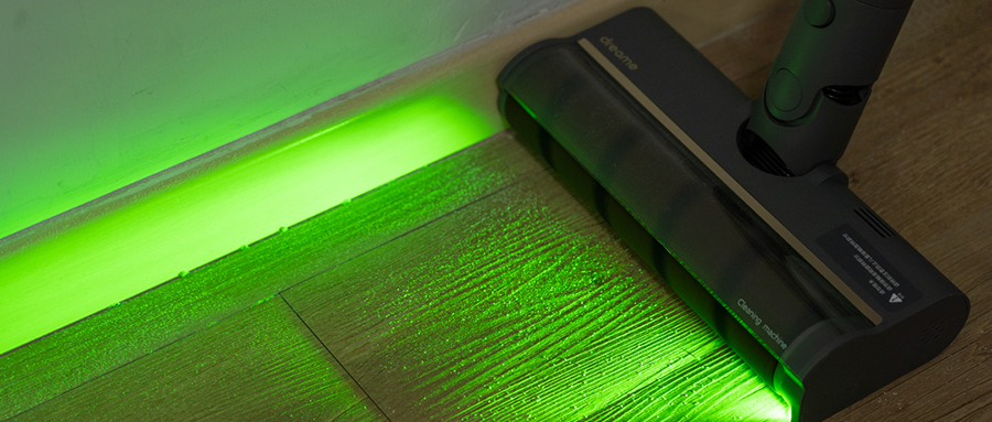 向着前面的目标发力,追觅科技研发出了绿光显尘技术。这一技术与激光探测的相似之处是,能够把地面上的微小灰尘、颗粒放大数倍。地板墙角处难以清理的宠物毛发、食物残渣等,会在绿光照射下“无处遁形”,同时绿光光线柔和均匀,能让用户在清洁时的观感更为舒适。