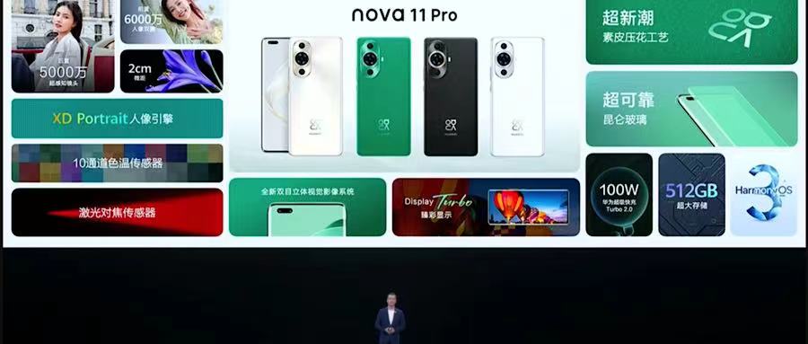 在影像方面,nova 11前置采用6000万像素4K超广角镜头,后置采用5000万像素RYYB主摄加800万像素超广角微距镜头组合。nova 11 Pro和nova 11 Ultra支持前置双目立体视觉影像系统,前置采用了6000万像素超广角镜头与800万像素变焦镜头。nova 11 Ultra还拥有十档物理可变光圈,可根据光线明暗、距离进行变化。同时,nova 11系列还具备人像暗光增强技术和人像光影提升技术,使得图像细节更加丰富。