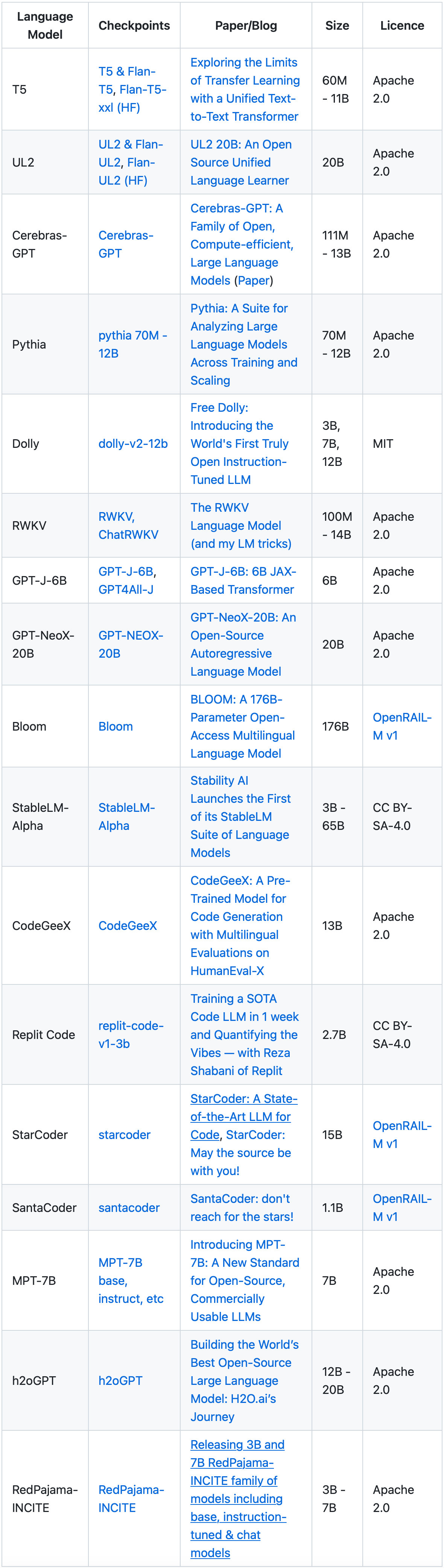 一个GitHub项目汇总了被授权可用于商业用途的大型语言模型(LLM),目前已包含T5、UL2、Cerebras-GPT、Pythia、Dolly、RWKV、GPT-J-6B、GPT-NeoX-20B、Bloom、StableLM-Alpha、CodeGeeX、Replit Code、StarCoder、SantaCoder、MPT-7B、h2oGPT、RedPajama-INCITE等17个大型语言模型,并附有相应论文或博客文章的链接。