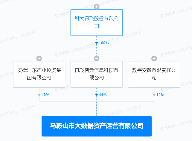 根据天眼查公告,马鞍山市大数据资产运营有限公司于近日成立,注册资本1亿元,法定代表人为王子樵。公司经营范围含互联网数据服务;互联网安全服务;数据处理和存储支持服务;人工智能公共数据平台等。股东信息显示,该公司由安徽江东产业投资集团有限公司、科大讯飞子公司讯飞智元信息科技有限公司、数字安徽有限责任公司分别持股46%、44%、10%。