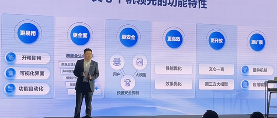 百度集团副总裁侯震宇说,文心千帆大模型平台是全球首个一站式的企业级大模型平台。所谓“一站式”是指不仅提供大模型服务,还提供大模型开发和应用的整套工具链,并支持各类第三方大模型,未来将成为大模型生产和分发的集散地。