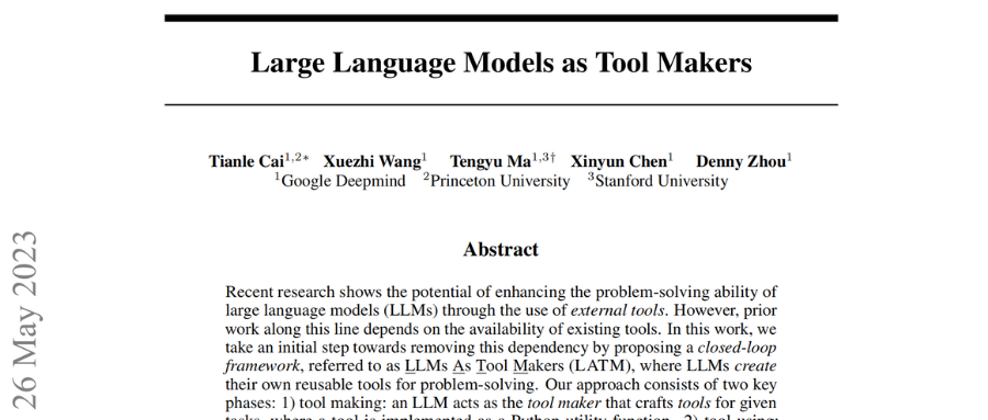 智东西6月5日消息,来自谷歌DeepMind、普林斯顿大学、斯坦福大学的研究团队提出了一个名为LATM( LLMs As Tool Makers )的框架,这个框架涵盖两个LLM(大语言模型),其中像GPT-4这样的高性能LLM能够成为独立的工具制造者。