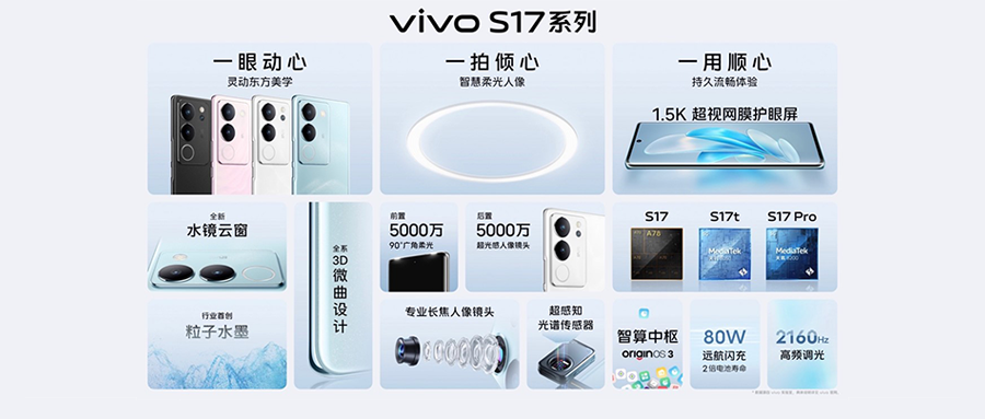 智东西5月31日消息,vivo刚刚正式发布了vivo S17系列手机新品,其采用的粒子水墨工艺是其主要特点之一,此外夜景人像拍照是该系列此次升级的重点特性。vivo还发布了旗下首款半入耳主动降噪耳机vivo TWS Air Pro。