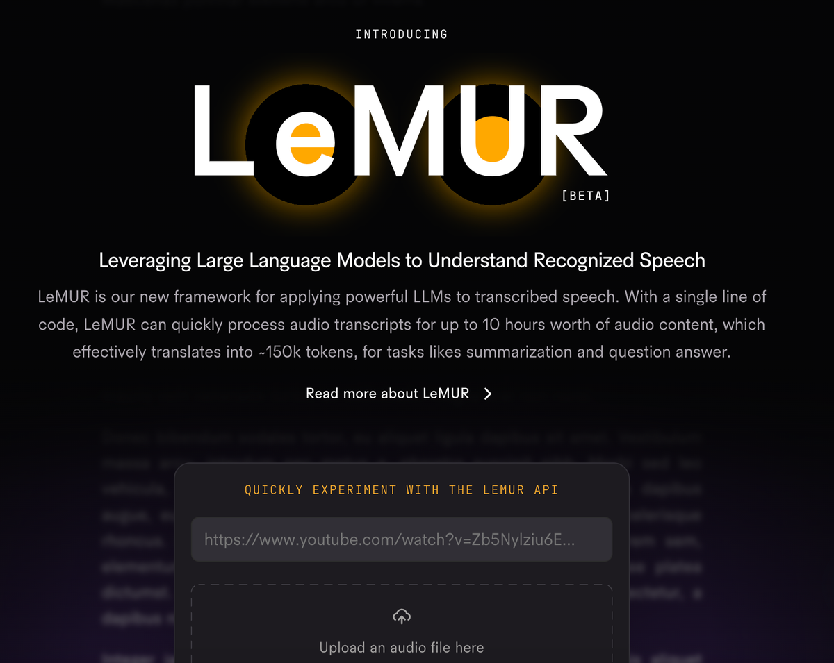 LeMUR是Leveraging Large Language Models to Understand Recognized Speech(利用大型语言模型来理解识别的语音)的缩写,是将强大的大型语言模型应用于转录的语音的新框架。通过AssemblyAI的Python SDK,只需一行代码,LeMUR就能快速处理长达10小时的音频内容的转录,有效地将其转化为约 15万个token。相比之下,现成的、普通的大型语言模型只能在其上下文窗口的限制范围内容纳最多8K或约45分钟的转录音频。