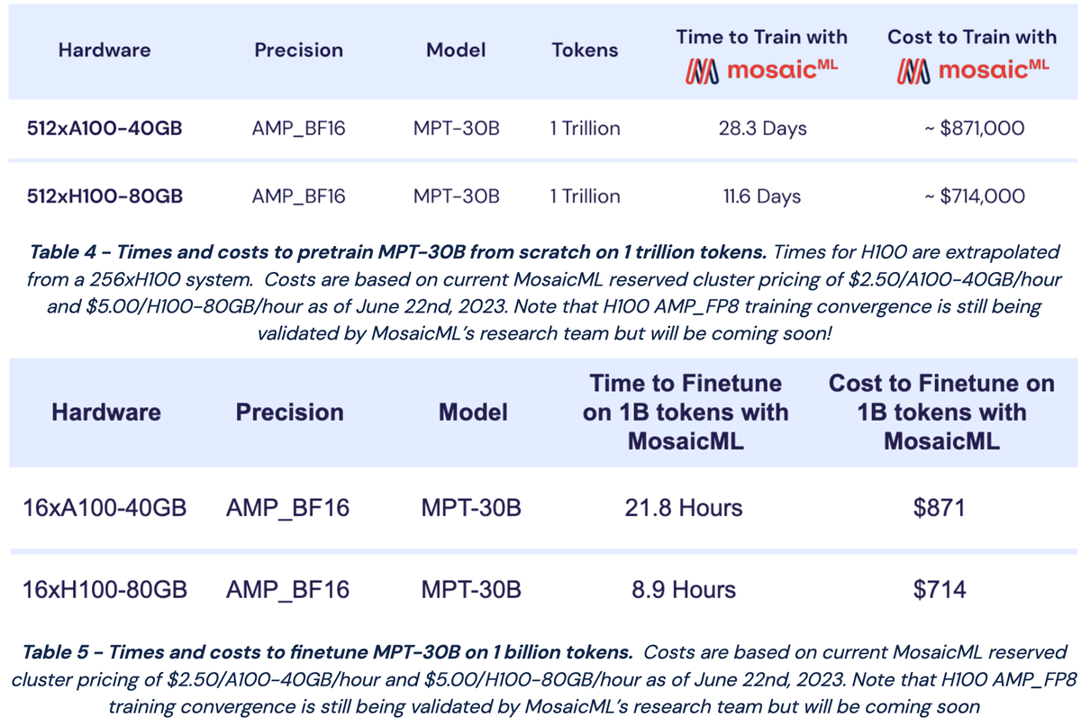 AI创业公司MosaicML在6月22日发布其开源语言模型MPT-30B。MosaicML称其是“第一个在H100上训练的大型语言模型”。