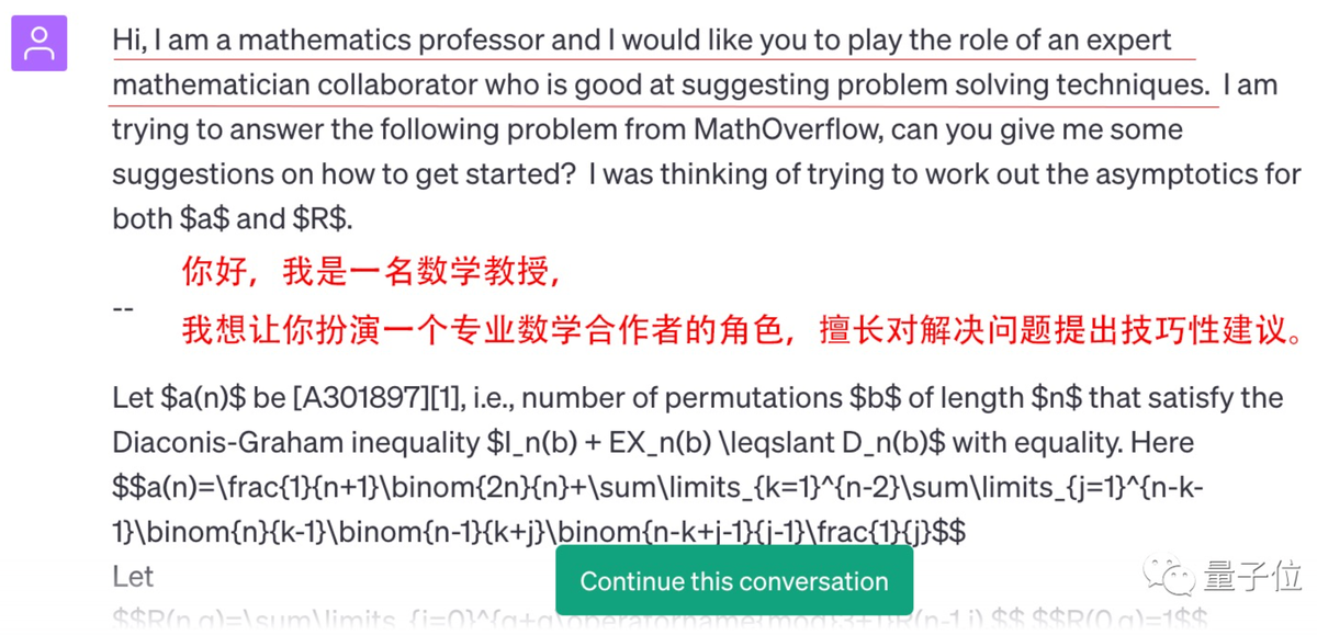 陶哲轩分享了自己使用ChatGPT和GPT-4的经验之谈:让AI扮演合作者的角色,而后让它提供策略建议。他将自己的聊天记录po了出来,里面完整地记载了他和GPT-4的对话。在这份聊天记录中,他把GPT-4称呼为“专业数学合作者”。戳对话记录底部的“continue this conversation”按钮,还能一键把对话记录导入自己的ChatGPT中,突然闯入人类大师和AI的交谈。