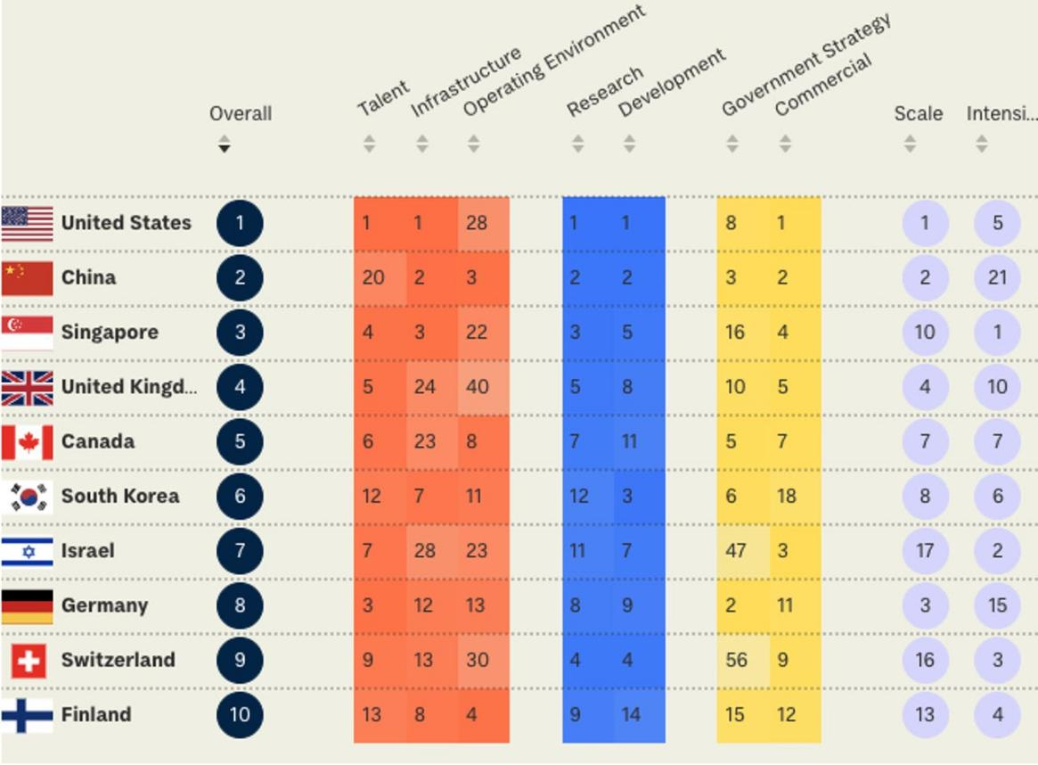 英国传媒机构Tortoise Media近日发布了2023年全球AI指数排名。前三名分别是:美国、中国、新加坡。自2020年该榜单首次发布以来,美中两国始终稳居前二,而此前一直位居第三位的英国在今年首次被新加坡超越。据悉,Tortoise Media使用投资、创新和实践三个指标来确定各国在AI发展方面的排名。