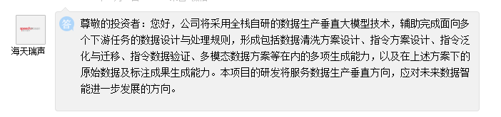 据36氪报道,海天瑞声在互动平台称,公司将采用全栈自研的数据生产垂直大模型技术,辅助完成面向多个下游任务的数据设计与处理规则,形成包括数据清洗方案设计、指令方案设计、指令泛化与迁移、指令数据验证、多模态数据方案等在内的多项生成能力,以及在上述方案下的原始数据及标注成果生成能力。
