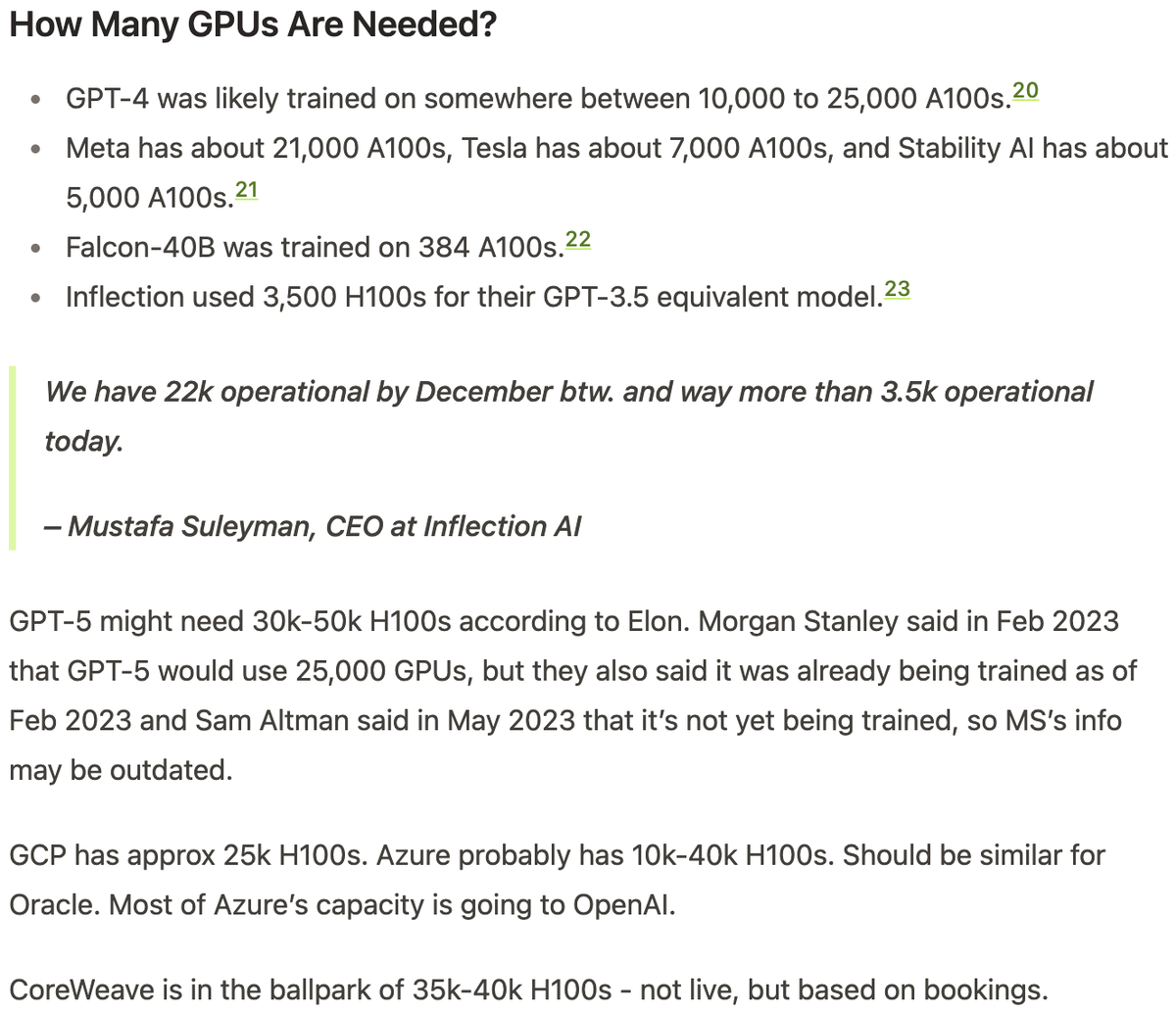 该文章预测GPT-4可能在10000到25000张A100上进行了训练,Meta拥有约21000张A100,特斯拉拥有约7000张A100,Stability AI拥有约5000张A100,Falcon-40B在384张A100上进行了训练。Inflection在其GPT-3.5等效模型中使用了3500张H100。GPT-5可能需要30000-50000张H100。GCP拥有大约25000张H100。微软Azure可能有10000-40000张H100,Oracle应该类似。CoreWeave预订的H100数量约为35000-40000张。