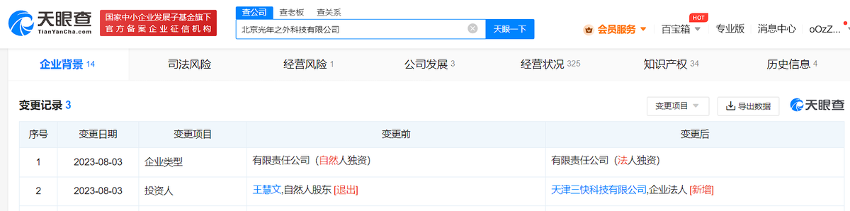 据36氪今日报道,天眼查App显示,近日,北京光年之外科技有限公司发生工商变更,全资股东由王慧文变更为美团旗下天津三快科技有限公司。北京光年之外科技有限公司成立于2018年7月,法定代表人为王慧文,注册资本100万人民币,经营范围含技术服务、技术转让、技术开发、技术推广、技术咨询,销售自行开发的产品,计算机系统服务等。