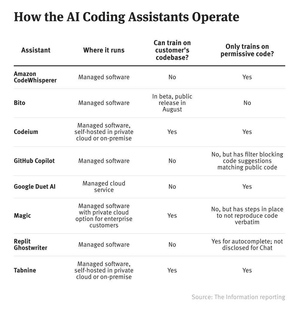 据The Information 8月16日报道,其对市面上8款代码辅助工具进行了考察,包括GitHub Copilot、Magic、Bito等,以比较和对比它们的能力,并采访了它们的运营人员。其报告显示,一些编码助手具有能够在虚拟私有云或本地安全托管的优势,包括Codeium、Magic、Tabnine和即将推出该功能的Bito。