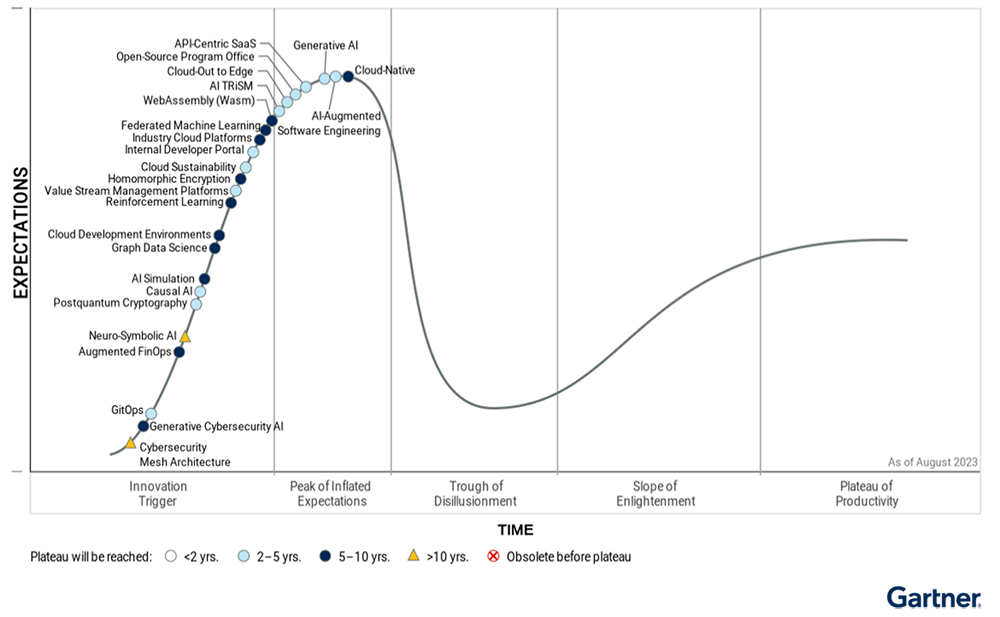 市场调查机构Gartner于8月16日发布的报告称,生成式AI正处于“期望膨胀期”(Peak of Inflated Expectations),预计将在2-5年内实现效益转型。