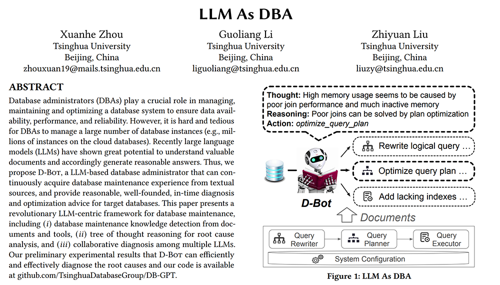 清华大学研究团队于8月10日发布论文《LLM As DBA》,提出了基于大型语言模型(LLM)的数据库管理员D-Bot,可以不断从文本源中获取数据库维护经验,为目标数据库提供合理及时的诊断和优化建议。该技术有望在保证数据库安全性的基础上,降低数据库管理成本。