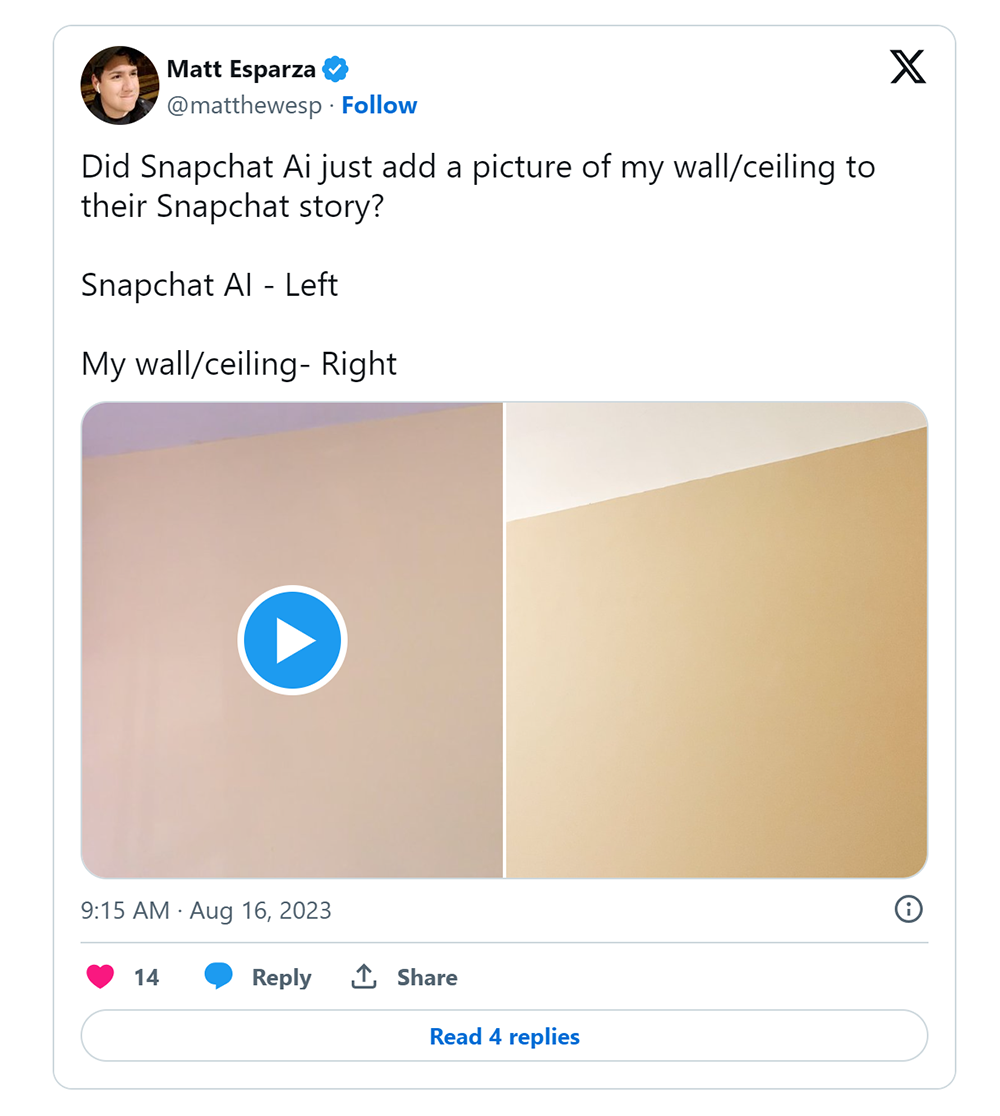 据TechCrunch报道,近日多名用户反映Snapchat的AI功能出现故障,在聊天中发布用户为曾提到过的消息。一名用户在X上称:“我的Snapchat AI随机发布了一个1秒的故事视频,但不回复我的消息,我真的吓坏了。”还有用户称Snapchat AI发布了一段看起来很像他家墙壁和天花板的神秘视频。