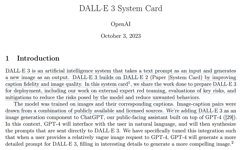 今天凌晨,OpenAI在官网宣布,DALL·E 3正式上线ChatGPT Plus和企业版。同时,OpenAI还开放了DALL·E 3的研究论文和系统卡,研究论文介绍了DALL·E 3模型训练相关细节,覆盖模型能力的提升、模型的训练和微调、文本编解码器、模型评估方法等内容;系统卡介绍了OpenAI为部署DALL·E 3所做的准备工作,包括外部专家红队工作、关键风险的评估,以及减少模型带来的风险和缓解措施等。