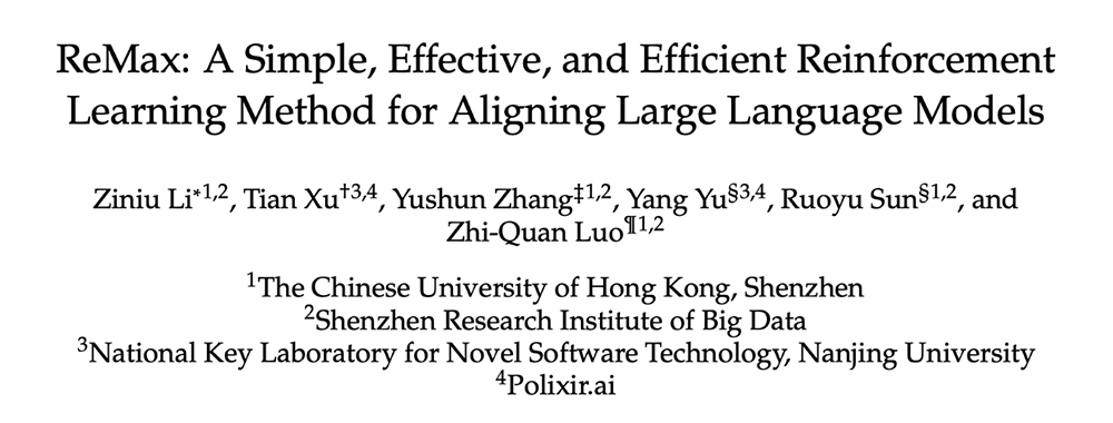 据机器之心报道,10月17日,来自香港中文大学(深圳)、南京大学等机构的华人团队发表论文,介绍了一种名为ReMax的新算法,专为RLHF(基于人类反馈的强化学习)而设计。ReMax在计算效率和实现简易性上超越了最常用的算法PPO,约减少50%的GPU内存,实现2倍的训练速度提升,核心部分实现只需6行代码,且性能没有损失。