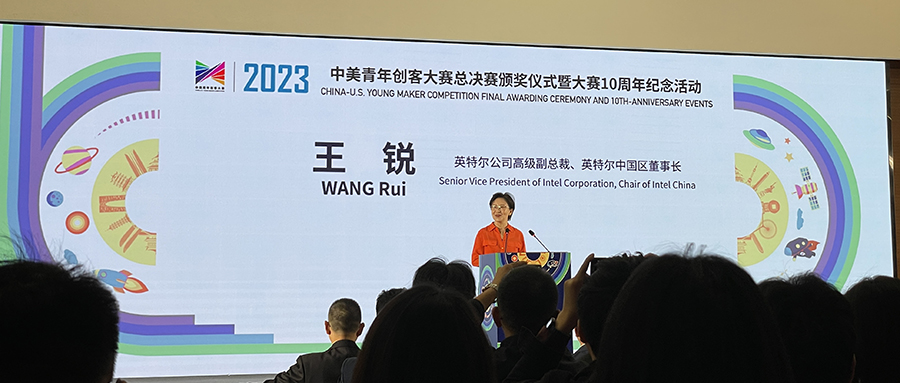 英特尔公司高级副总裁、英特尔中国区董事长王锐在致辞时分享说:“英特尔公司非常荣幸能够持续支持中美青年创客大赛,帮助中美青年运用数字技术为人类共同福祉和可持续发展的未来大胆创新,开放合作,促进中美人文交流。创新是英特尔的基因,人才是创新的基石。而教育是育人成才、点石成金的关键。未来,英特尔将进一步深耕包括青年人才在内的数字化能力建设,为各阶段、各行业的人才提供接触科技知识、学习数字技能的机会,为社会输送带动创新的活水之源。”