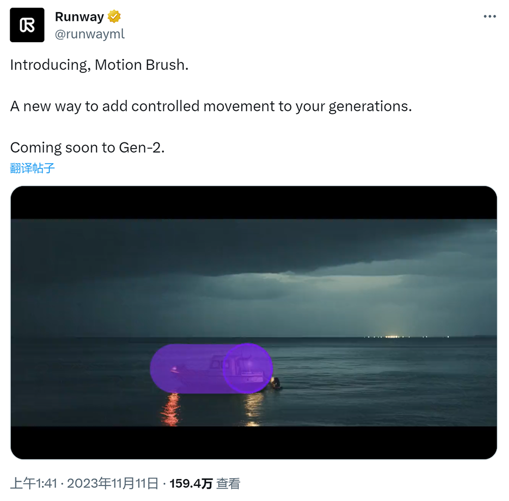 11月11日,AI创意视频应用Runway于社交平台X上发布新功能运动画笔(Motion Brush),通过笔刷涂抹使图像中的物体动起来,该功能即将在旗下软件Gen-2中推出。