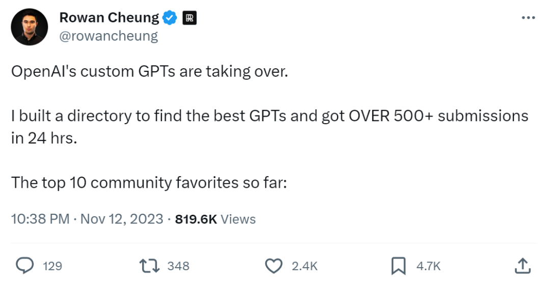 据机器之心报道,11月12日,关注科技的媒体公司The Rundown创始人Rowan Cheung发布了一个网站,用来搜索、过滤和提交所有最佳的自定义GPT,这些GPT在24小时内收到了超过500次的提交。Rowan Cheung总结了社区最受欢迎的Top 10名单,分别是帮助用户创建并托管网站的Designer GPT,与在线音乐流媒体平台Spotify连接的Spotify Explorer GPT,帮助寻找远程办公点的Nomad GPT,一句话构建网站的Grimoire GPT,食谱、营养顾问Healthy Chef,分析图表的Market Analyst GPT,快速设计故事情节、故事场景的Screenplay GPT,产品经理Kraftful GPT,转换绘画风格的Drawn to Style以及根据上传的实物照片生成菜谱的Recipe Snap GPT。