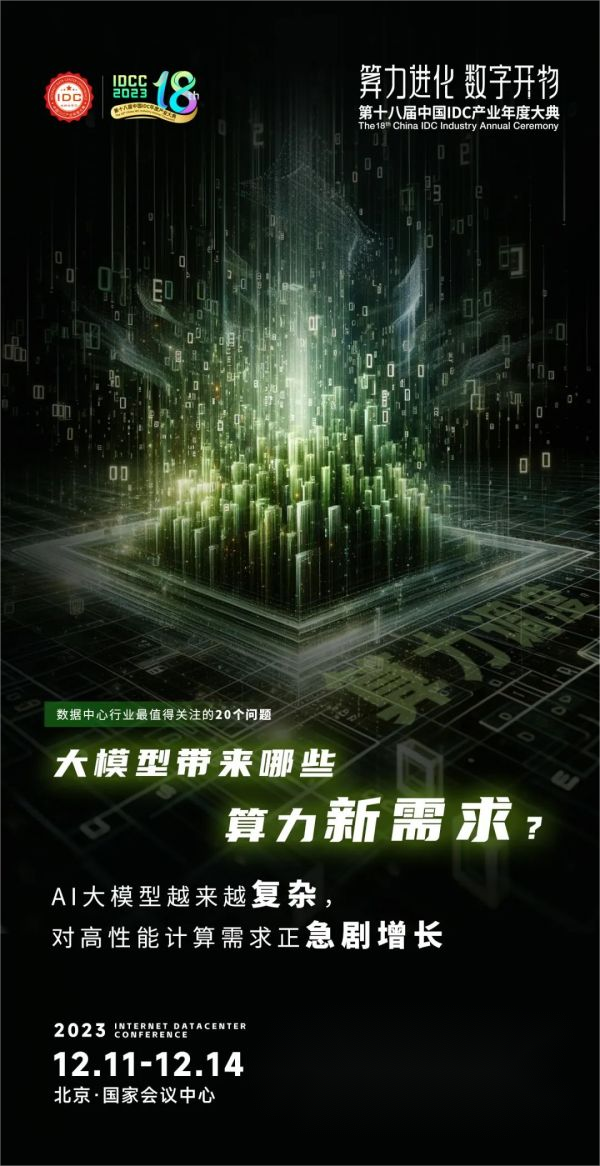 在12月11日-12月14举办的第十八届中国IDC产业年度盛典(IDCC2023)上,将有来自人工智能大模型、智算基础设施、服务器、算力租赁企业、智能驾驶等领域的专家、学者和产业精英,共同探讨人工智能对算力产业带来的变化和挑战。