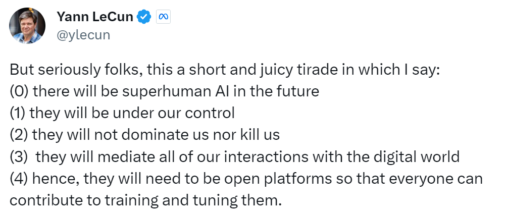 11月25日,Meta首席科学家杨立昆(Yann LeCun)在一次访谈中谈到超人AI等话题,随后他在社交平台X上总结了自己的主要观点:未来将出现超人AI,但它们不会主宰人类,而是受到人类的控制,它们将调解我们与数字世界的互动。因此,这些AI需要一个开放的平台,以便每个人都能为训练和调整它们做出贡献。