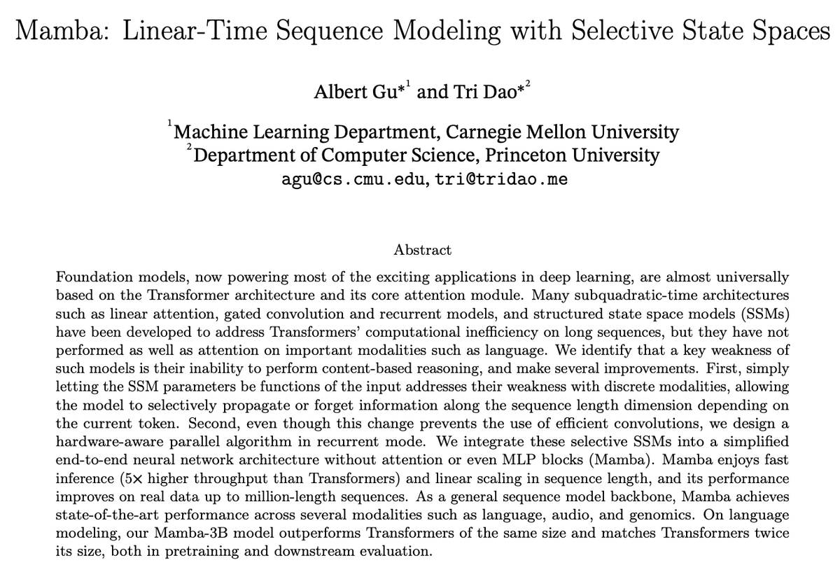 为了解决Transformer在长序列上的计算效率低下问题,卡内基梅隆大学(CMU)和普林斯顿大学的研究者于12月1日提出了一种新架构Mamba(曼巴)。Mamba是一种状态空间模型(SSM),具有快速推理和序列长度的线性缩放优势,据称吞吐量比Transformer高5倍,并且在真实数据上处理长达百万长度的序列时性能有所提升。作为一个通用的序列模型主要干,Mamba在语言、音频和基因组学等多种领域都实现了最先进的性能。在语言建模方面,Mamba-3B模型在预训练和下游评估方面都优于同等大小的Transformer,其性能甚至可与两倍大小的Transformer相媲美。