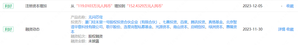 企查查显示,11月30日,AI大模型创企无问芯穹获得股权融资,投资方包括百度、腾讯、智谱AI等。12月5日,无问芯穹的注册资本从119万增加到152.4万。无问芯穹成立于今年5月,创始团队来自清华大学电子工程系,致力于提供面向垂直领域大模型的软硬件一体化解决方案,降低大模型的使用门槛,为客户提供高性价比的系统解决方案。