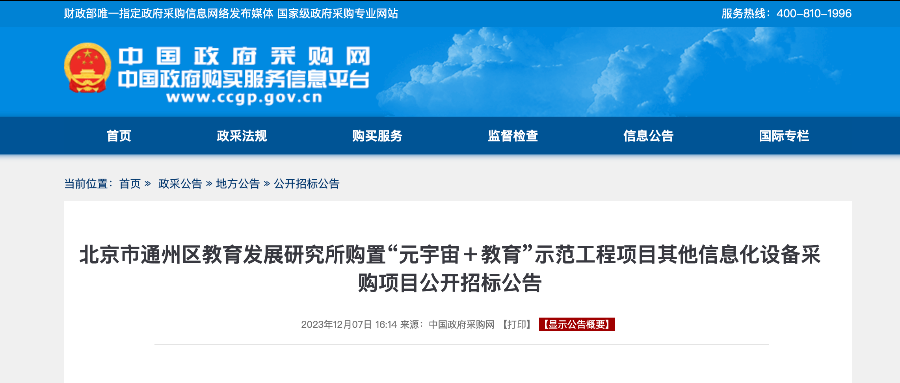 智东西12月8日报道,中国政府采购网显示,北京市通州区教育发展研究所于2023年12月07日发布《北京市通州区教育发展研究所购置“元宇宙+教育”示范工程项目其他信息化设备采购项目公开招标公告》公告。