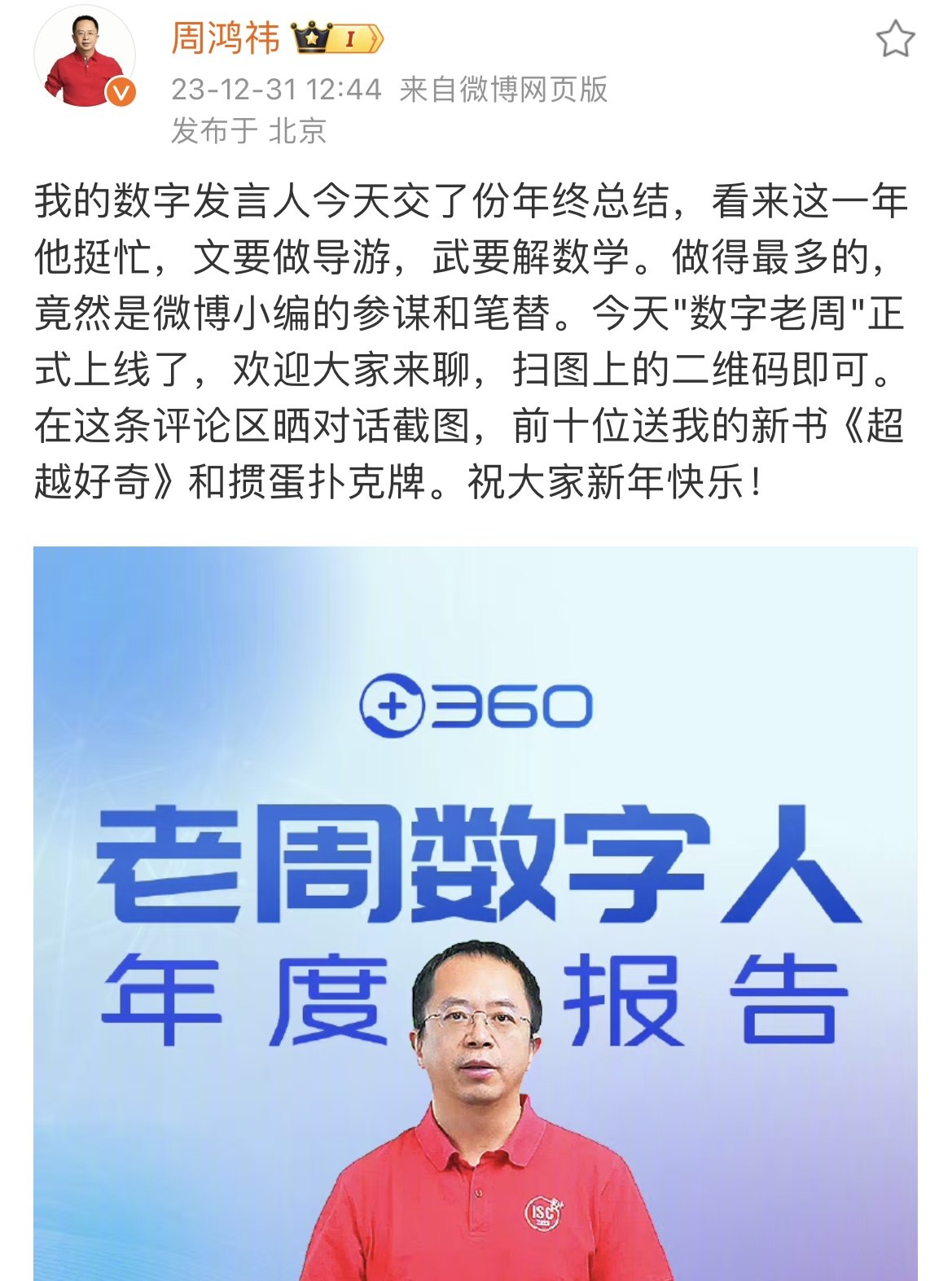 360集团创始人、董事长周鸿祎12月31日发微博宣布,其数字发言人“数字老周”正式上线,并公布了一份年度报告。