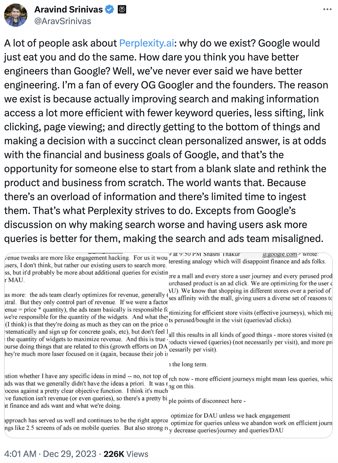 12月29日,对话式搜索引擎创企Perplexity AI的CEO Aravind Srinivas在社交平台X上公开回应有关竞争不过搜索引擎大厂谷歌的质疑,称Perplexity存在的原因是通过更少的关键字查询、筛选、链接点击、页面浏览,提高搜索效率和信息访问效率;直接找到问题根源,然后用一个简洁、清晰、个性化的答案,便于人们做出决定,这与谷歌的财务和商业目标是不一致的。