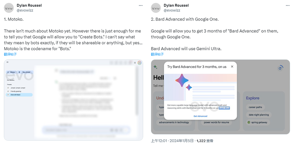 安卓开发者Dylan Roussel今日于社交平台X上透露了一系列谷歌正在研发的新功能或产品:可以创建聊天机器人的平台Motoko;名为Bard Advanced的升级版聊天机器人Bard,由Gemini Ultra模型驱动,通过订阅存储服务Google One付费提供,有3个月免费试用;提供Bard使用示例的探索功能Gallery;可能用于管理长时间运行任务的Tasks功能;聊天界面背景、前景切换功能;用于扩展或改进提示词的Power Up。Roussel强调,这些都是未发布的功能,随时可能发生变化,也有可能不会落地。