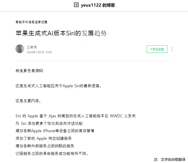 1月4日,韩国社交平台Naver网友发表博客,透露苹果机遇Ajax模型的生成式AI版本Siri将在WWDC上发布。生成式AI将为Siri添加更多个性化和自然对话功能、提升不同设备之间的高效管理、添加新的苹果特定创作服务、增加外部服务之间的联动等。