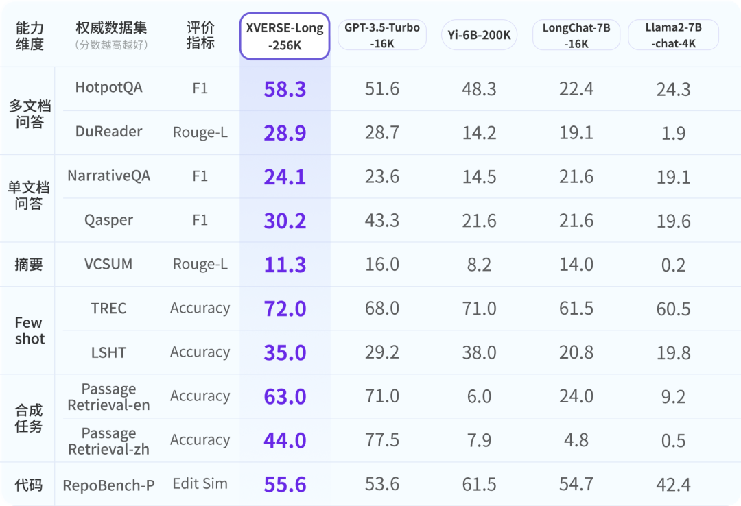 据AI创企元象XVERSE微信公众号发文,今日,元象发布全球首个上下文窗口长度256K的开源大模型XVERSE-Long-256K,支持输入25万汉字。该模型全开源,无条件免费商用,且附带训练教程。据介绍,XVERSE-Long-256K支持超长文本输入,可用于大规模数据分析、多文档阅读理解、跨领域知识融合;在角色扮演或聊天应用中,缓解模型“忘记”之前对话的记忆力问题,或胡说八道的“幻觉”问题等;更好支持智能体(AI Agent)基于历史信息进行规划和决策;帮助AI原生应用保持连贯、个性化的用户体验。