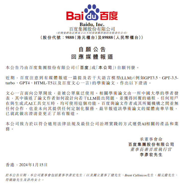 昨日,百度发布公告回应媒体报道,注意到有媒体报道一篇提及若干大语言模型的学术论文,作出以下澄清:相关学术论文由一所中国大学的学者发表,百度与论文作者或其所属机构之间并无任何合作,也并未向其提供任何定制化服务。最早报道该学术论文的媒体《南华早报》已就此作出澄清并更正了原有报道。公司致力于以适用法律法规和最佳公司治理实践的方式运营AI相关产品和业务。