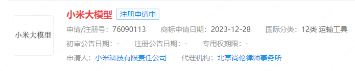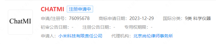 据企查查信息显示,小米近日申请注册科学仪器类“ChatMI”商标、运输工具类“小米大模型”商标,当前商标状态均为等待实质审查。其中“ChatMI”商标商品/服务包括模拟对话用聊天机器人软件、与语音传输设备连用的个人耳机、辅助人类和供人娱乐用具有交流和学习功能的类人机器人、智能音箱、科学研究用具有AI的人形机器人等。“小米大模型”商标商品/服务包括汽车、电动汽车、电动运载工具、摄影无人机等。
