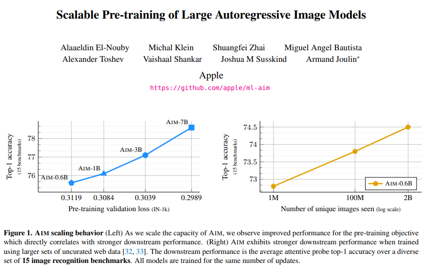 来自苹果的团队昨日在arXiv上发表论文,提出一组使用自回归生成目标进行预训练的视觉模型AIM,展示了图像特征的自回归预训练具有与文本对应物(即大型语言模型)类似的缩放属性。具体来说,该论文主要有两个发现:模型容量可以轻松地扩展到数十亿个参数;AIM有效地利用了大量未经筛选的图像数据集。