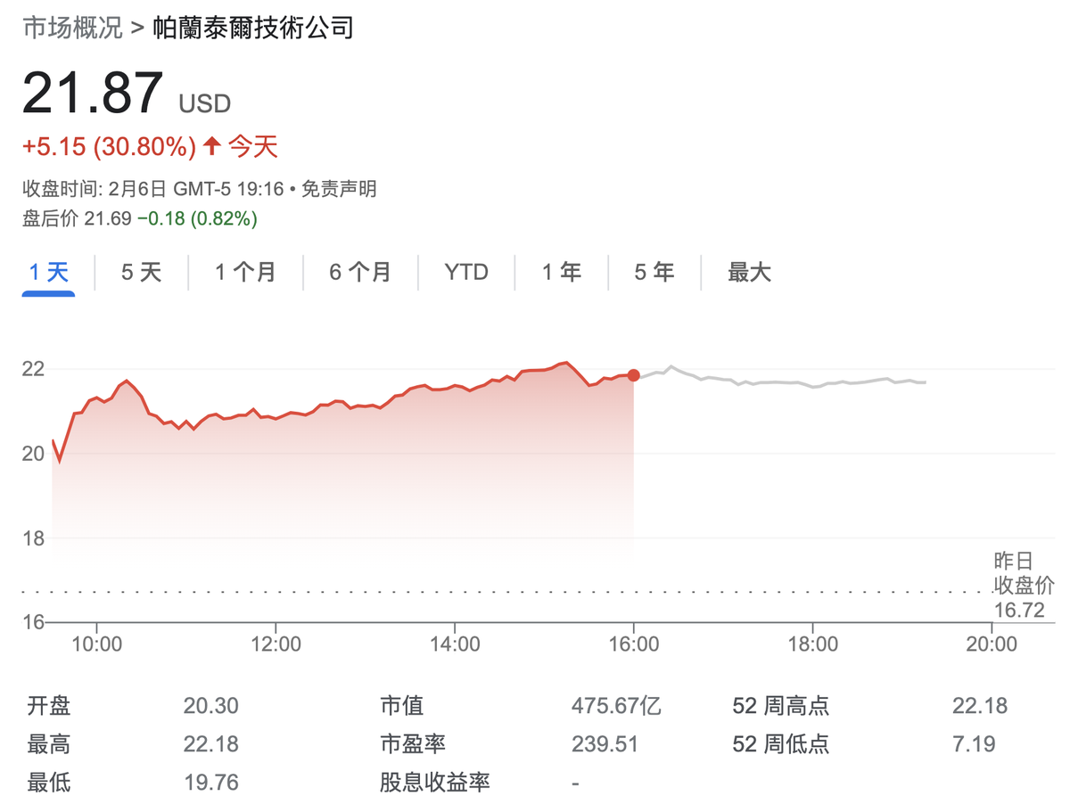 据英国路透社报道,数据分析软件制造商Palantir的AI产品需求增加带动了第四季度营收的强劲增长,令投资者兴奋不已,股价飙升近 30%。Palantir商业部门的收入同比增长32%至2.84亿美元,帮助该公司实现了6.08亿美元的总收入。