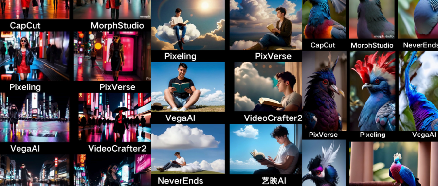 这一关基本没有难倒参赛选手,8款工具都生成了一个年轻人坐着读书的画面,不过PixVerse、Vega AI没能让人物坐在云上,NeverEnds则把云拽到了地面。VideoCrafter2、艺映AI没有拍到人物的屁股具体在哪儿,但从其背景能够看出大概率并不是云。
