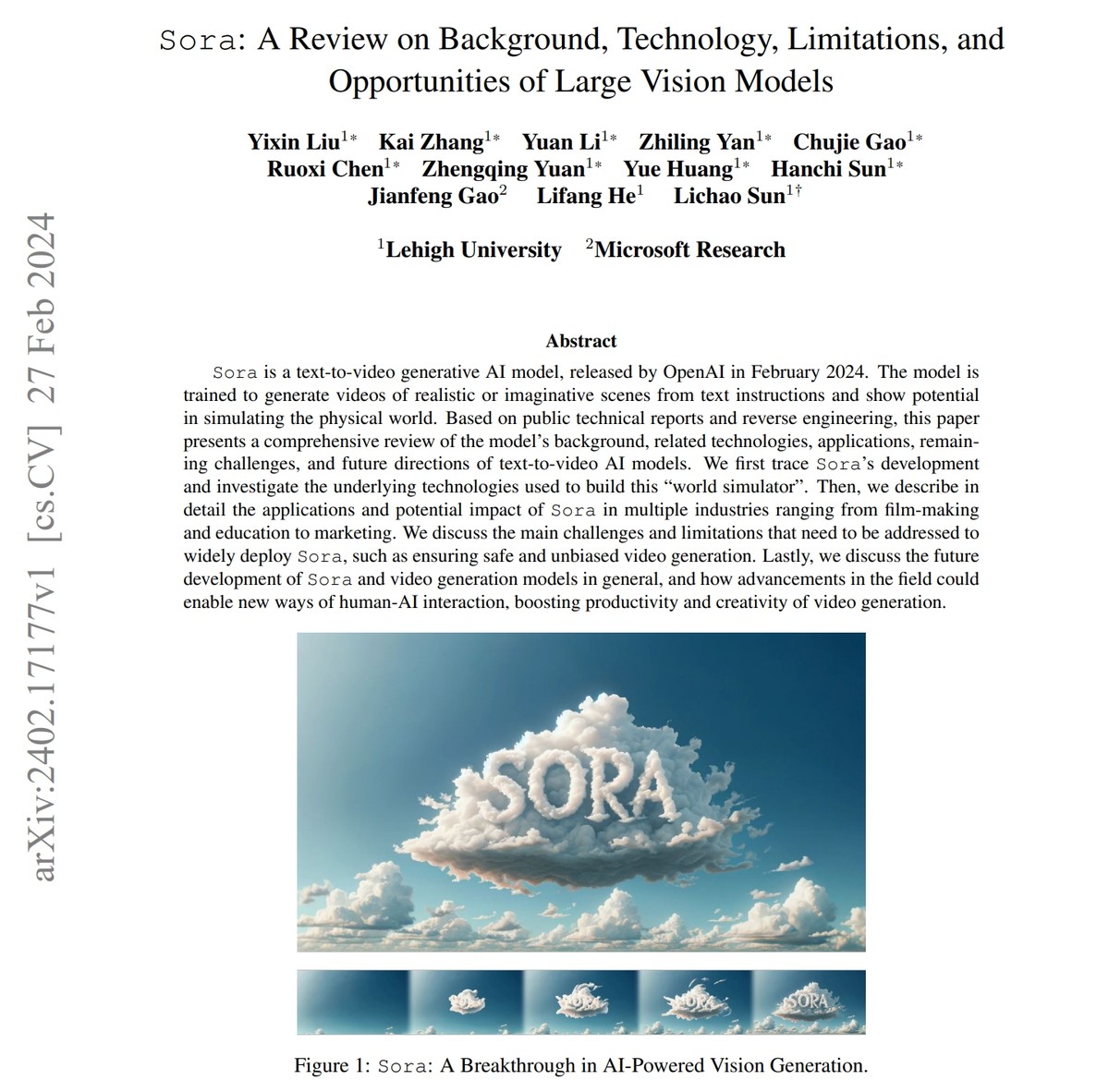 理海大学和微软研究员2月27日发布40页综述文章,对Sora模型的背景、相关技术、应用、剩余的挑战以及文本到视频AI模型的未来发展方向进行了全面的回顾,这是首个公布Sora“逆向工程”的报告,该报告提出,Sora面临物理现实主义挑战、时空复杂性、人机交互局限性、使用限制等几大挑战。